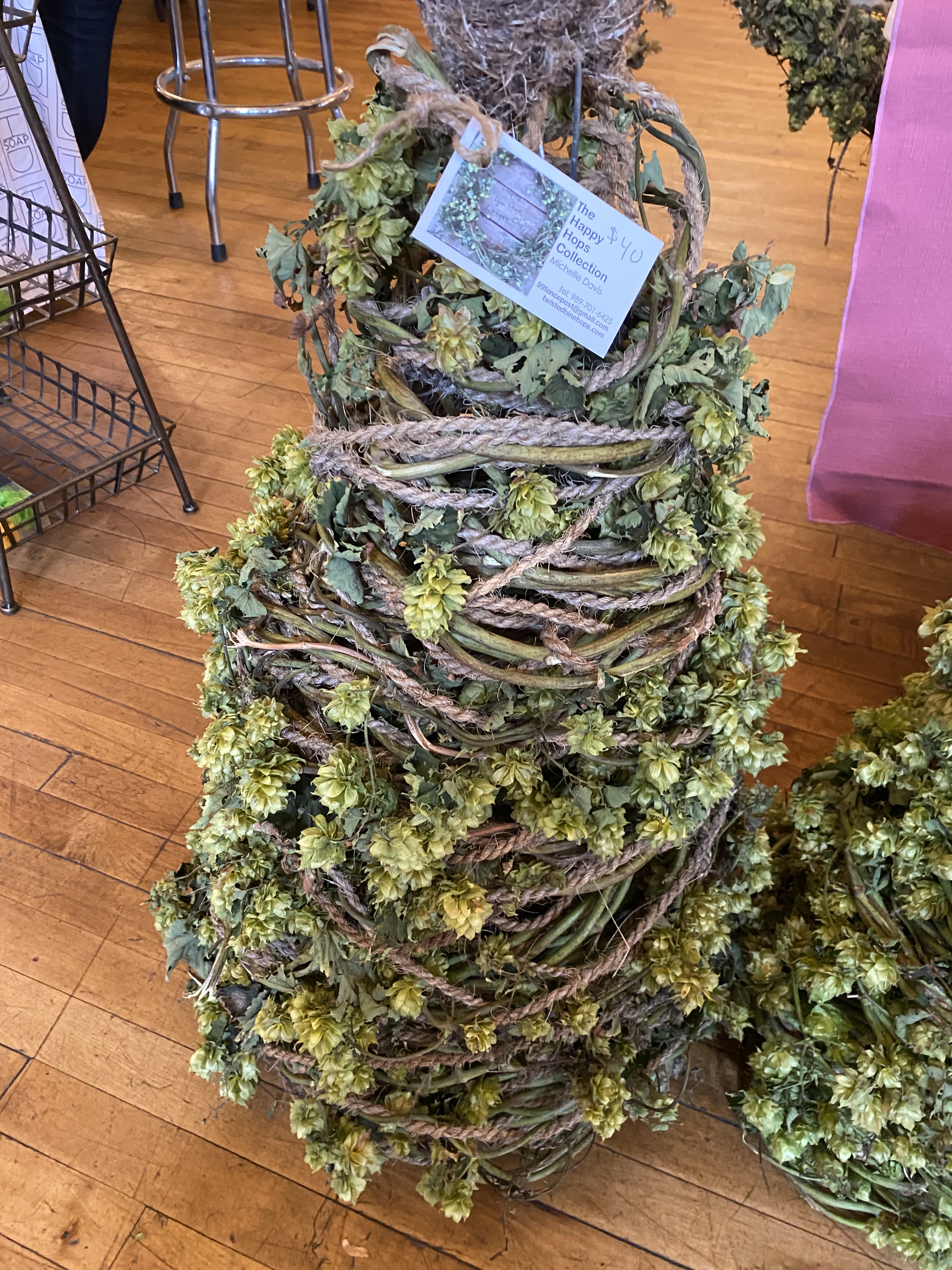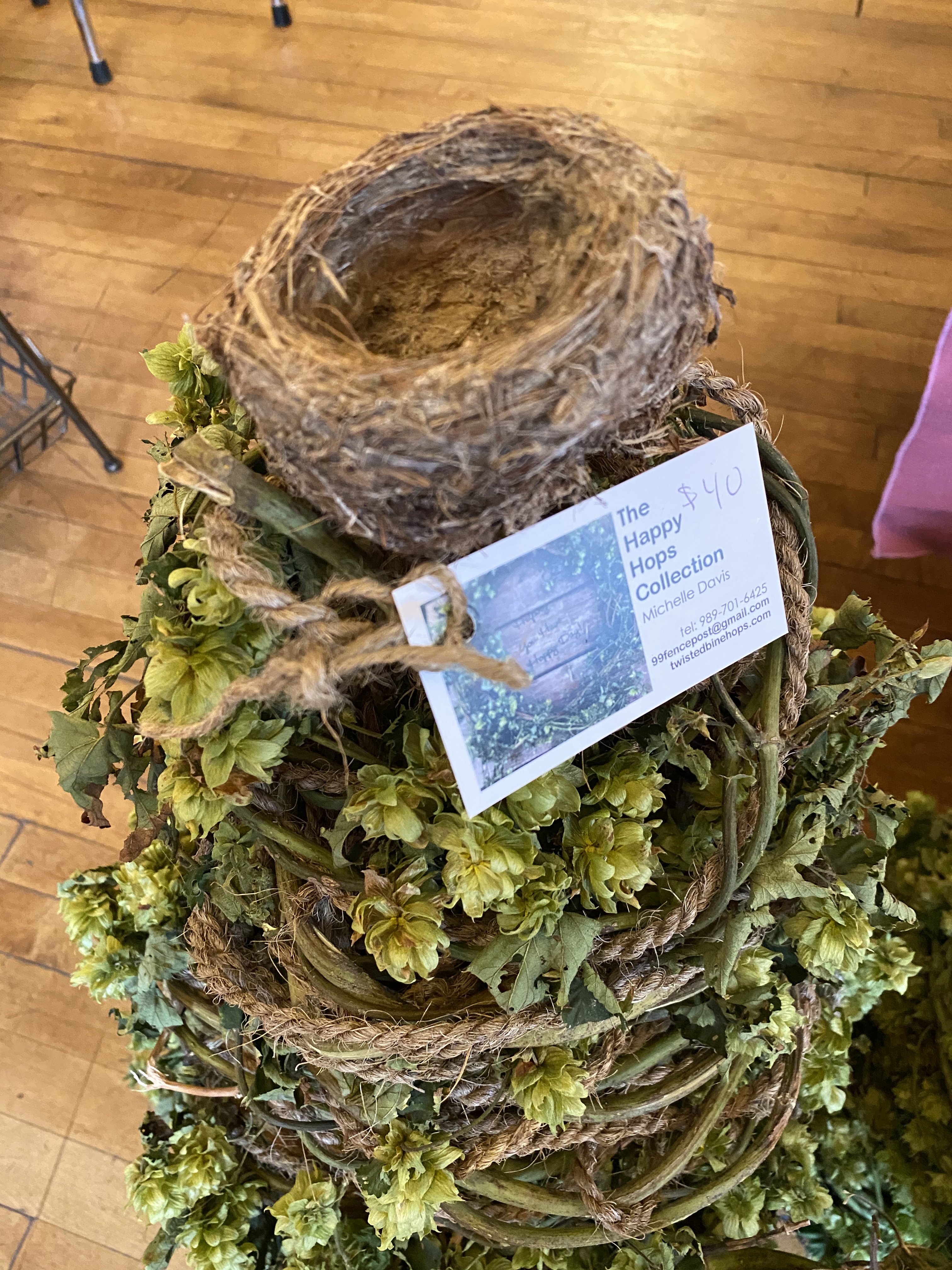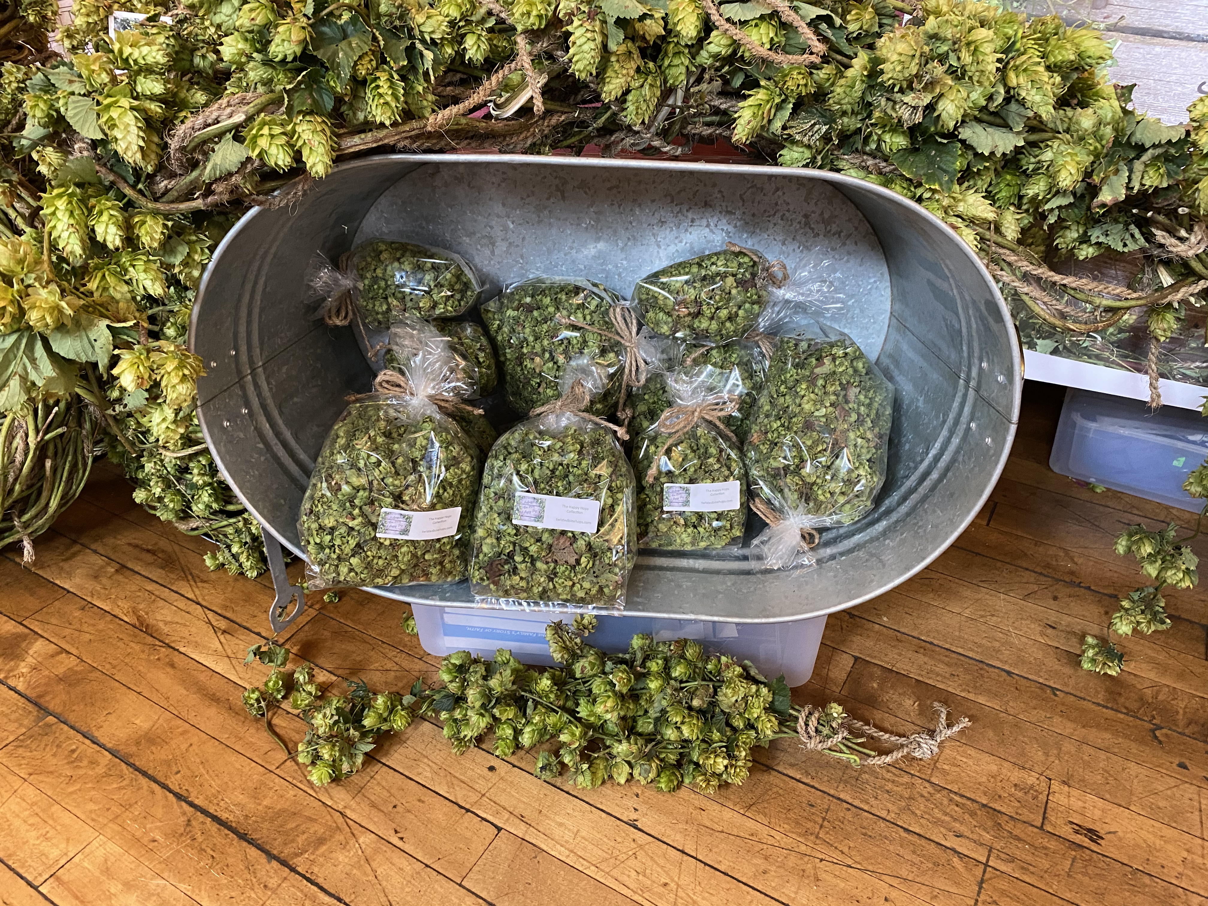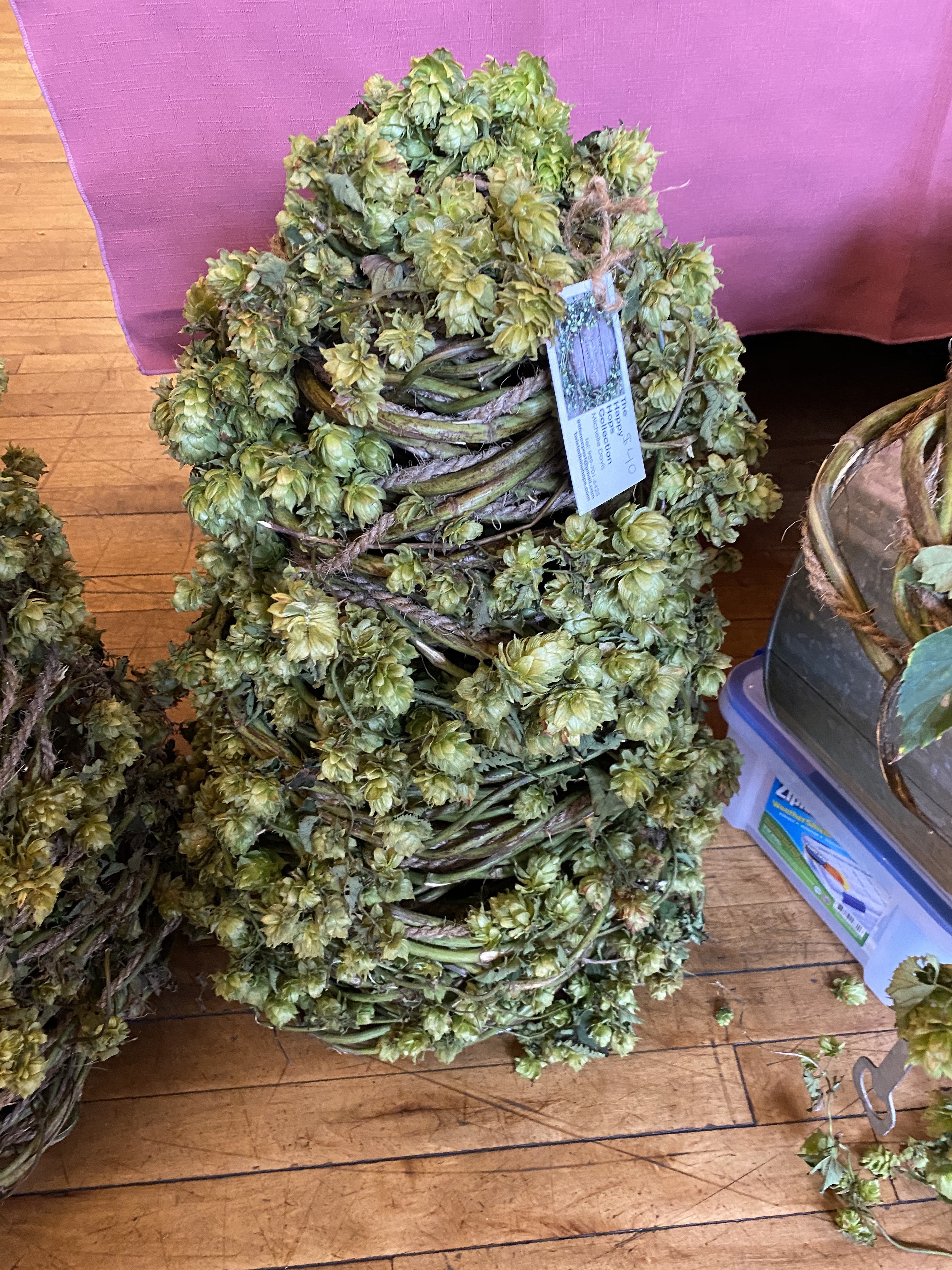 Here are some pictures from today’s event. Many people stopped by and complemented our hop display which included swags, wreaths, flower & hop arrangements and dried hop cone goody bags. Most people said they had never seen hop bines or even knew they were so beautiful and fragrant. Enjoy!